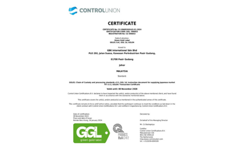 One of the pioneer in Malaysia to acquire GGL Certificate in year 2023 and to ship out GGL Certified PKS to Japan in January 2024